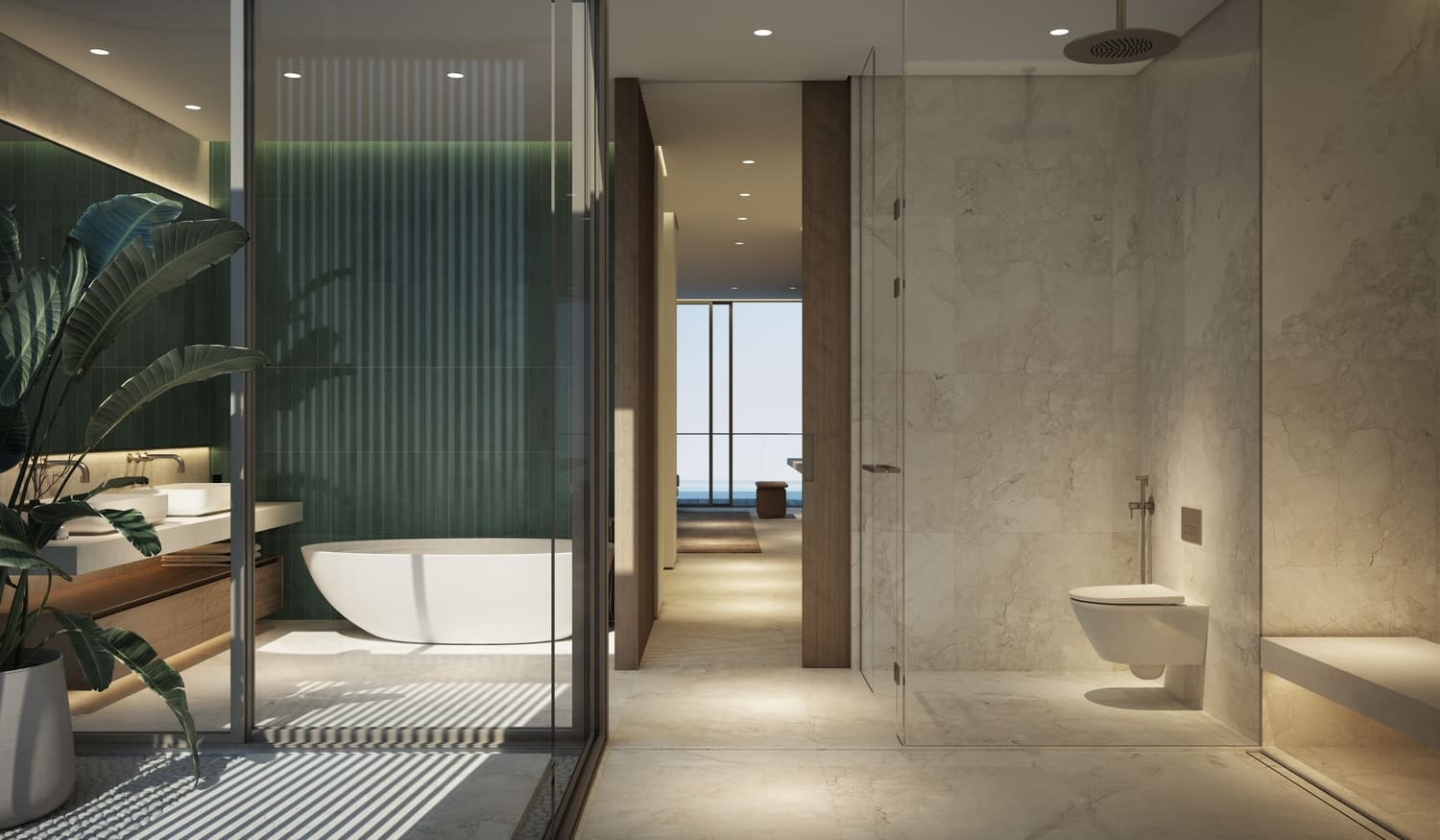 Погрузитесь в элегантность средиземноморского стиля с тщательно уложенной итальянской фарфоровой плиткой, фактурными матовыми стенами и скрытым освещением, которое усиливает изысканную атмосферу.